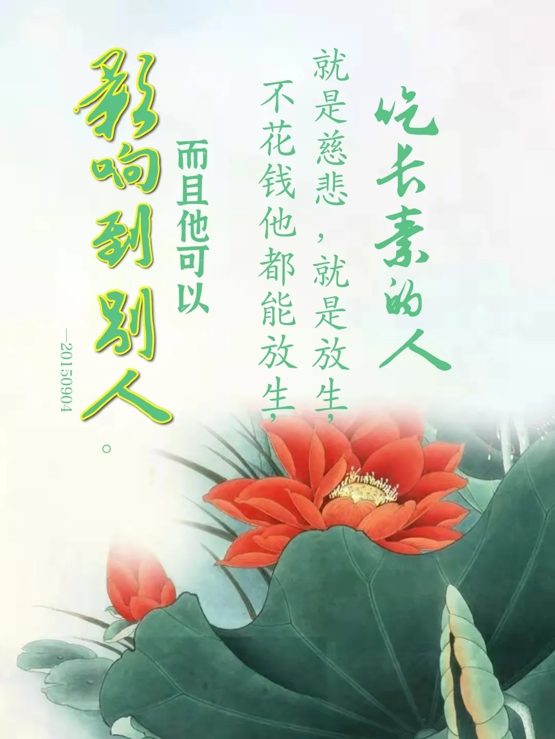 答:对啊。你只要宣布自己吃长素,实际上你少吃一顿荤,就是少杀一个生,你本身就已经在放生了。所以,吃长素的人就是慈悲,就是放生,不花钱他都能放生,而且他可以影响到别人。今天这个人吃荤的碰到你了:“咦,你这个人怎么吃素啊?”“哦,要慈悲……”就算他听不进。又碰到一个,又碰到一个……等碰到一百个的时候:“咦,这么多人吃素,说明我也应该吃素,说明这个是有道理啊!”好了,他一吃素了,你又救了一条命了。对不对啊?(对。如果许愿吃长素,不单是自己累积功德,也同时间影响到身边所有还不吃素的同修跟家人,渐渐地影响到他们、教育他们,就这样无形中救度了更多的生命)是啊是啊…