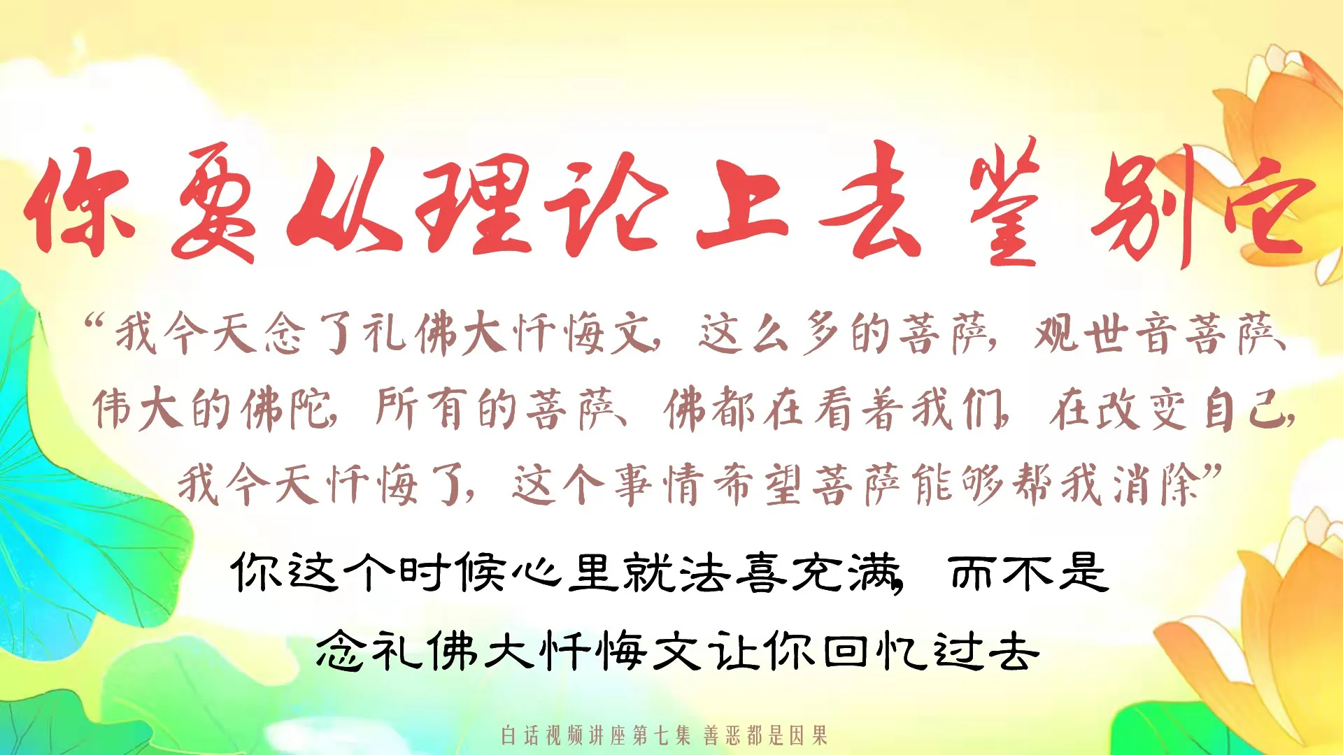 你要从理论上去鉴别它,“我今天念了礼佛大忏悔文,这么多的菩萨,观世音菩萨、伟大的佛陀,所有的菩萨、佛都在看着我们,在改变自己,我今天忏悔了,这个事情希望菩萨能够帮我消除”,你这个时候心里就法喜充满,而不是念礼佛大忏悔文让你回忆过去。