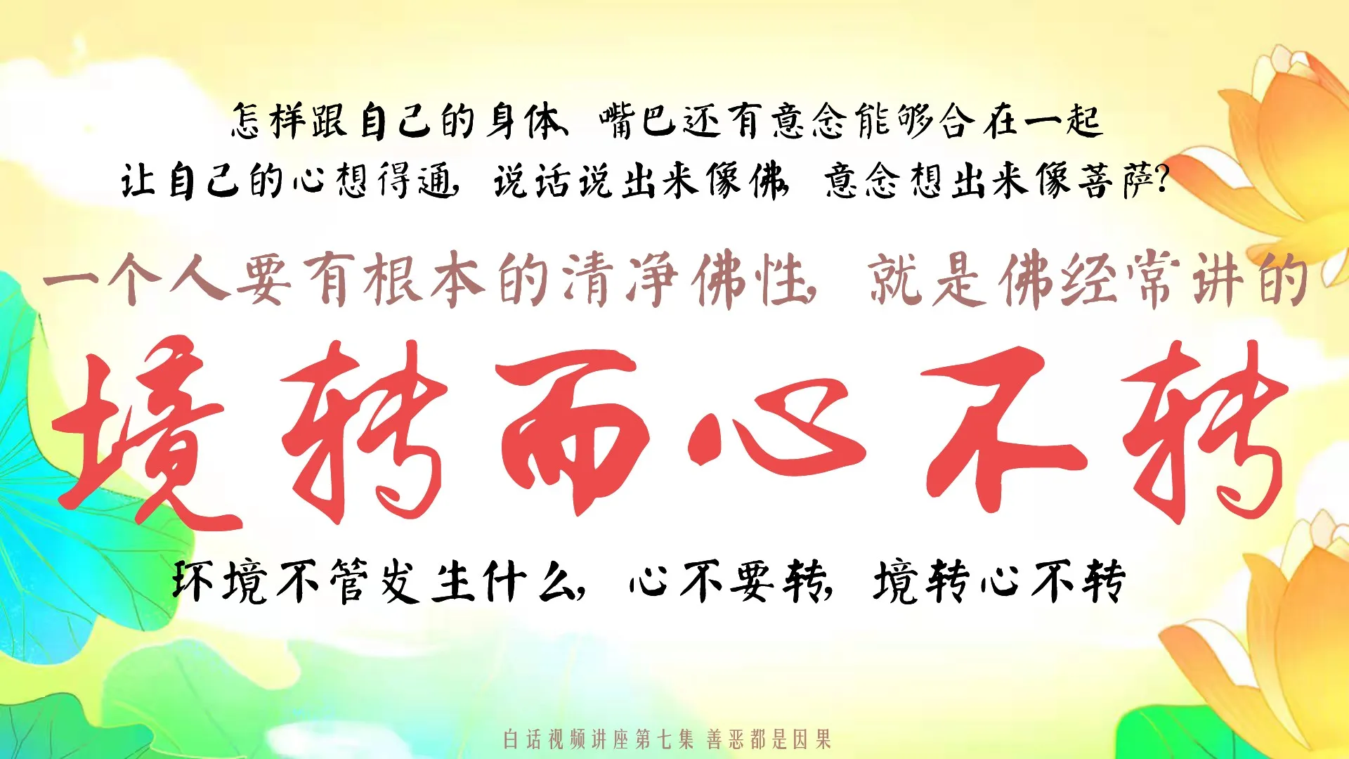 怎样跟自己的身体、嘴巴还有意念能够合在一起,让自己的心想得通,说话说出来像佛,意念想出来像菩萨?一个人要有根本的清净佛性,就是佛经常讲的境转而心不转。