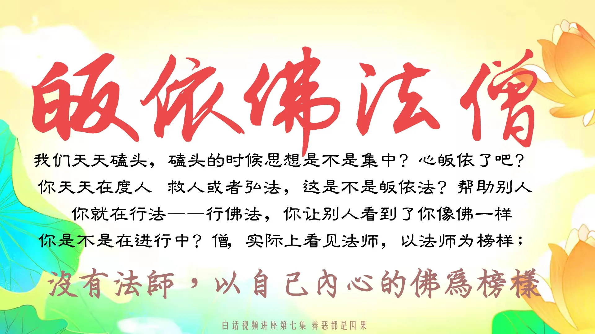 我们天天磕头,磕头的时候思想是不是集中?心皈依了吧?你天天在度人、救人或者弘法,这是不是皈依法?帮助别人,你就在行法——行佛法,你让别人看到了你像佛一样,你是不是在进行中?僧,实际上看见法师,以法师为榜样;没有法师,以自己内心的佛为榜样。