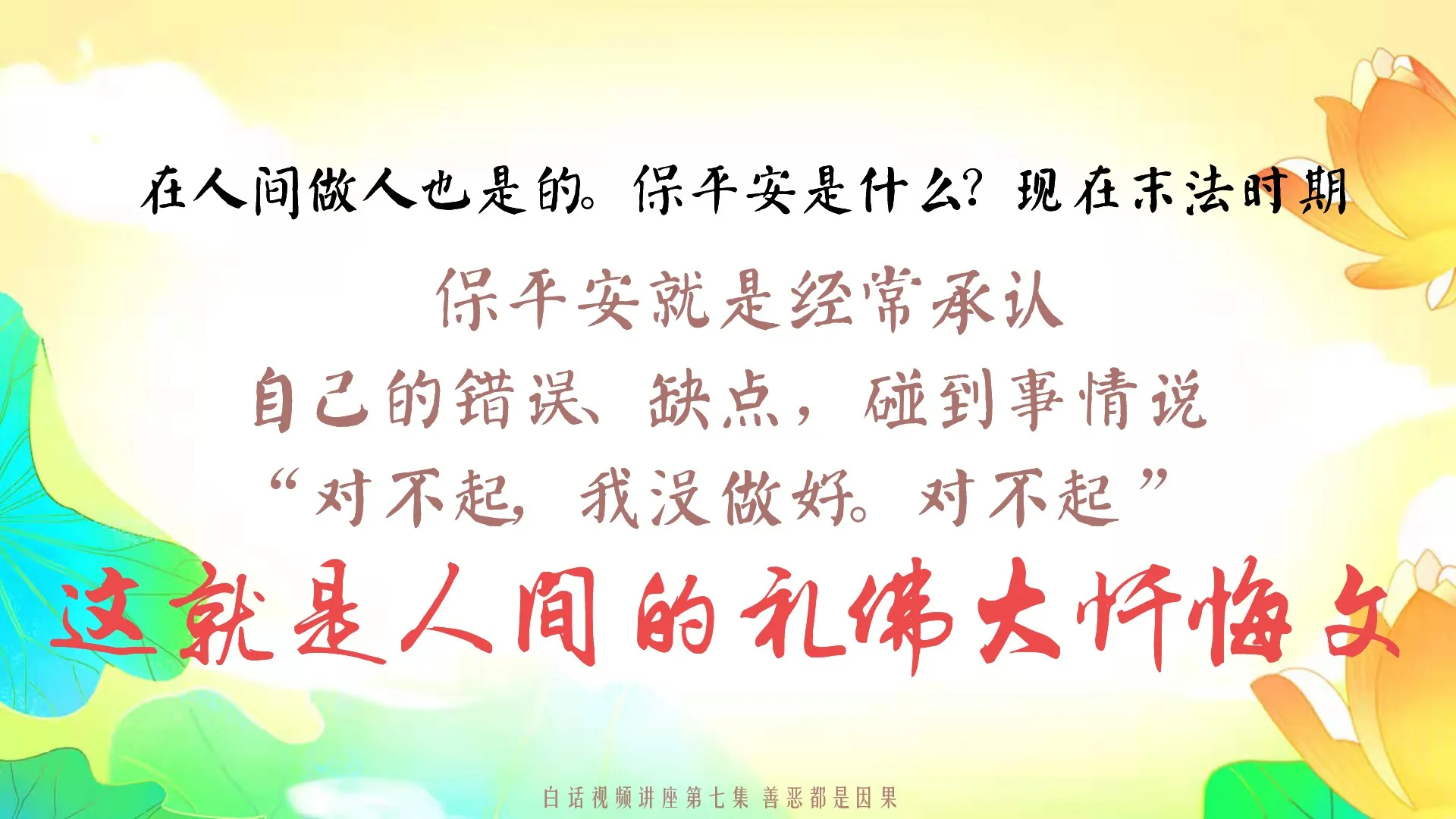 在人间做人也是的。保平安是什么?现在末法时期,保平安就是经常承认自己的错误、缺点,碰到事情说“对不起,我没做好。对不起”,这就是人间的礼佛大忏悔文。