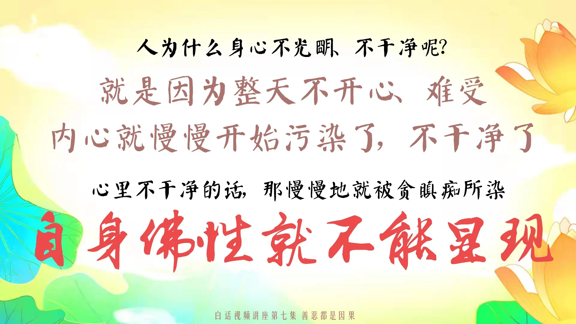 人为什么身心不光明、不干净呢?就是因为整天不开心、难受,内心就慢慢开始污染了,不干净了。心里不干净的话,那慢慢地就被贪瞋痴所染,自身佛性就不能显现