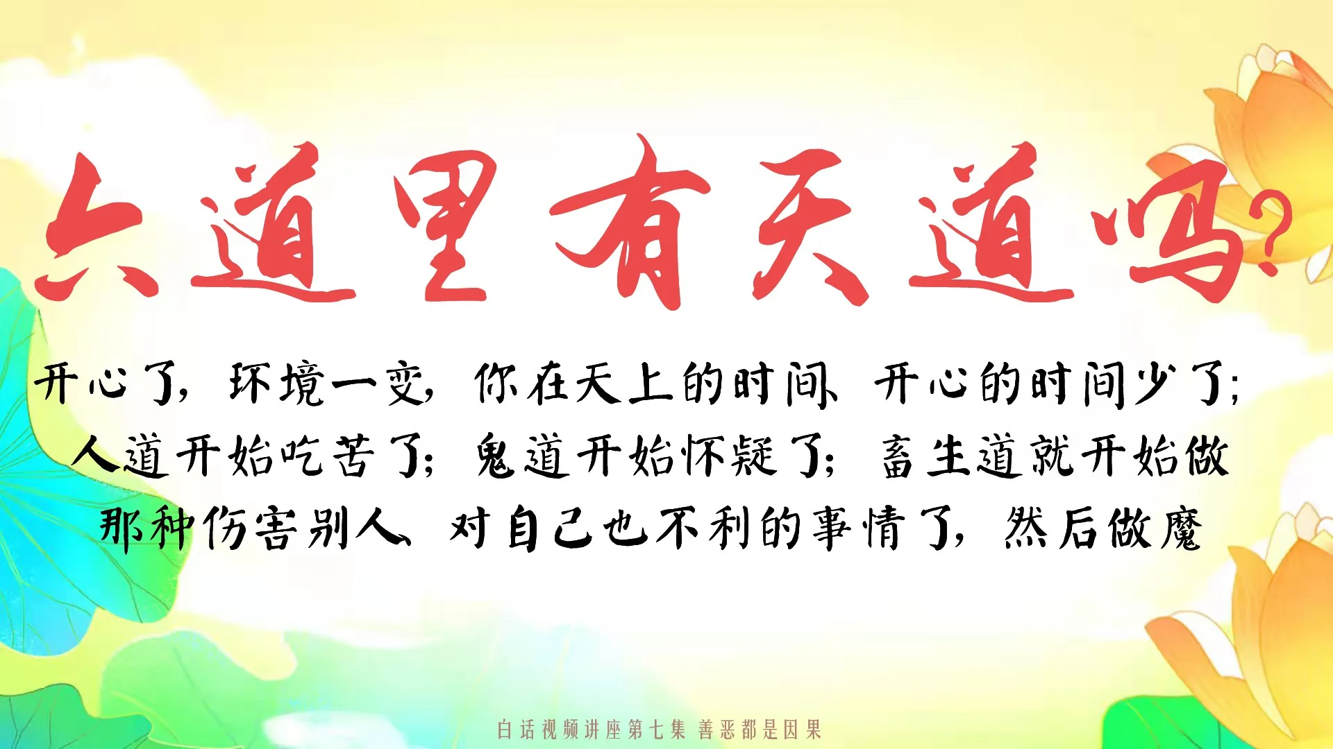 六道里有天道吗?开心了,环境一变,你在天上的时间、开心的时间少了;人道开始吃苦了;鬼道开始怀疑了;畜生道就开始做那种伤害别人、对自己也不利的事情了,然后做魔。