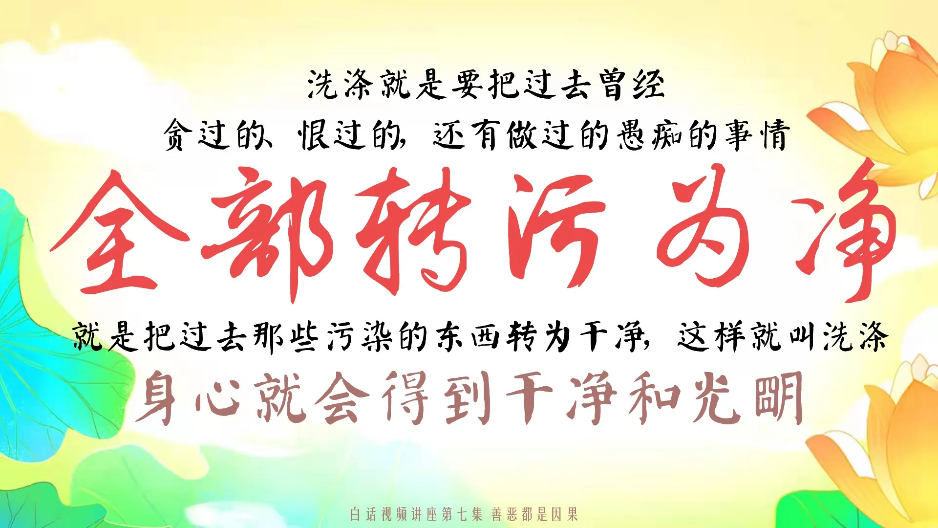洗涤就是要把过去曾经贪过的、恨过的,还有做过的愚痴的事情,全部转污为净,就是把过去那些污染的东西转为干净,这样就叫洗涤,身心就会得到干净和光明。