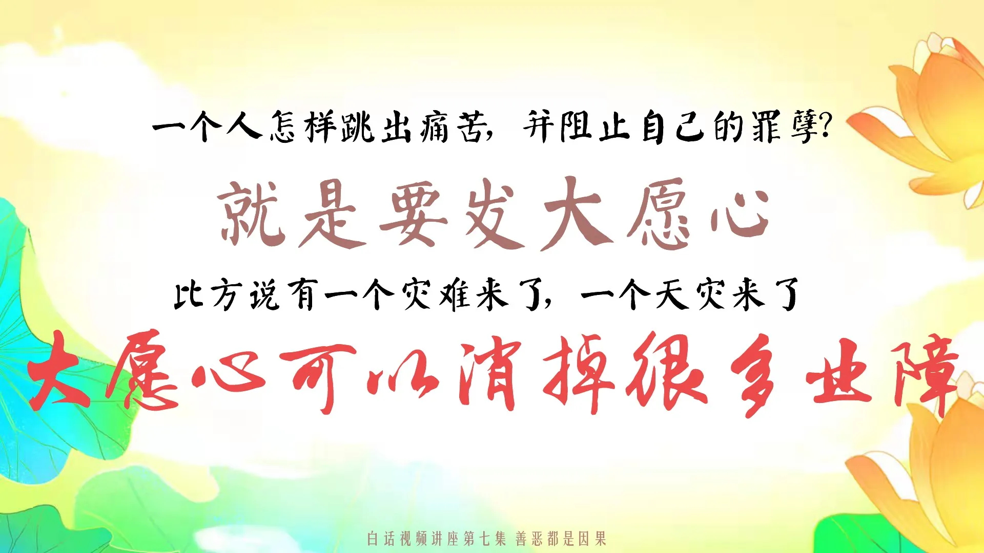 一个人怎样跳出痛苦,并阻止自己的罪孽?就是要发大愿心。比方说有一个灾难来了,一个天灾来了,大愿心可以消掉很多业障。