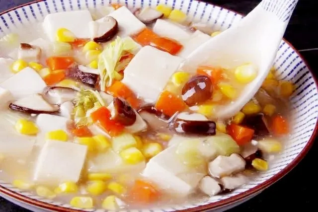 2. 芹菜切小段,玉米剥粒;3. 香菇丁倒入干锅,炒至表面微微变色爆香后,倒入其余蔬菜;4. 稍加炒制后加入适量水,随后倒入豆腐块;5. 中火稍加煮制,撒入盐、鲜蔬粉适量;6. 将淀粉加水调匀,锅开后倒入搅拌;7. 换小火炖至汤羹粘稠即可关火出锅。