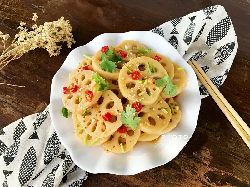 2. 煮好后捞出用冰水浸泡至凉透3. 莲藕切成你喜欢的厚度4. 除莲藕、香菜、芝麻以外,其余所有材料和剁碎的姜末、小辣椒粒一起放入盘中搅拌均匀5. 最后放入切好的莲藕拌均匀,送进冰箱放置约两小时入味,吃的时候撒上芝麻和香菜即可。