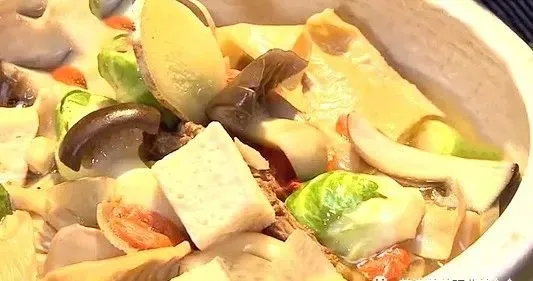 3.再依序加入腰果、松本茸、百灵菇、豆皮、腐竹、小麦角煮熟,最后再加入孢子甘蓝与所有调味料略煮即可。