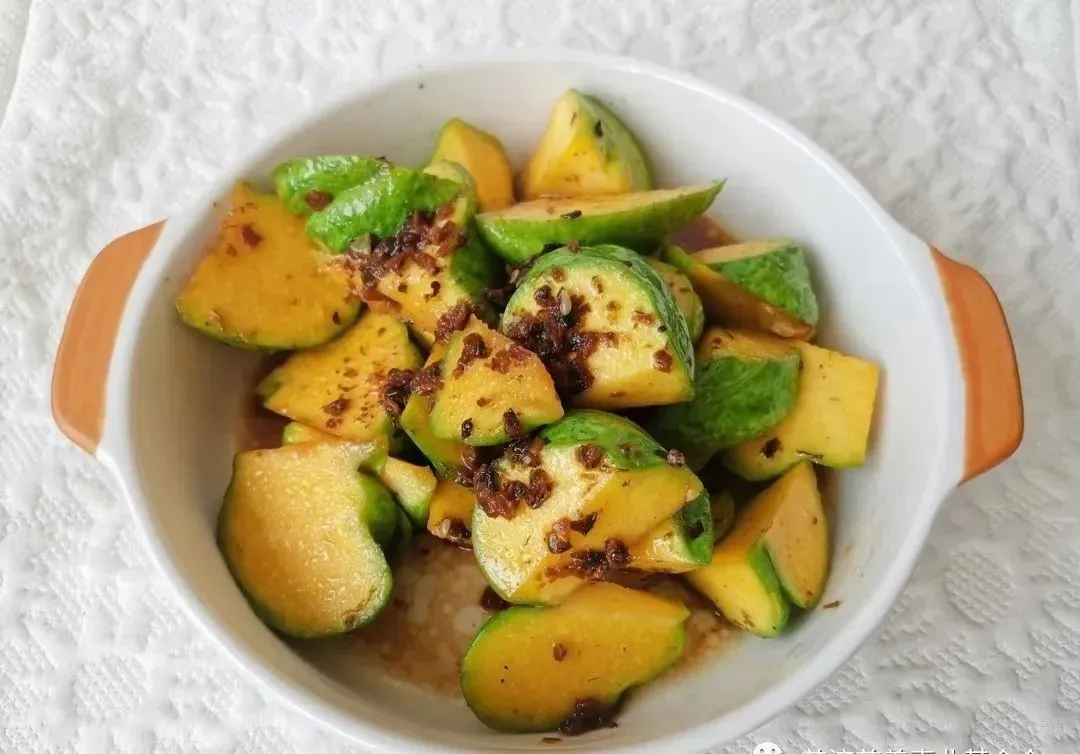 1.小南瓜切成块状,锅中放入油,热锅后放入南瓜翻炒后,加入适量水。