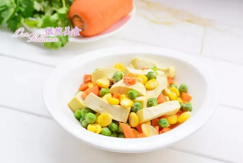 北豆腐300克,生姜1小块,豌豆100克,玉米150克,胡萝卜1截,植物油、盐、果蔬粉适量