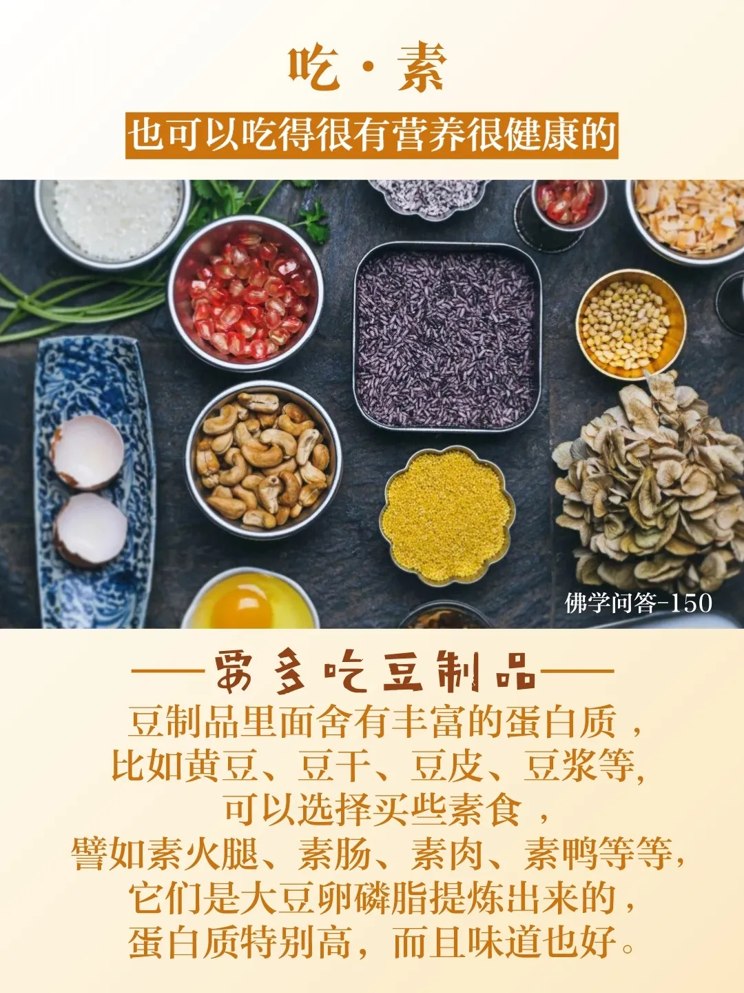 吃·素 也可以吃得很有营养很健康的。 要多吃豆制品, 豆制品里面舍有丰富的蛋白質, 比如黄豆、豆干、豆皮、豆浆等。 可以选择买些素食, 譬如素火腿、素肠、素肉、素鸭等等, 它们是大豆卵磷脂提炼出来的, 蛋白質特別高,而且味道也好。 佛学同答-150