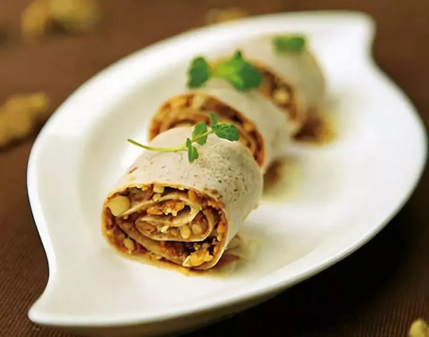 6. 将核桃仁、花生仁、大枣的混合物均匀撒在春卷皮上,卷起来,切成段即可