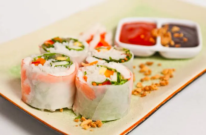 3. 温水泡10秒春卷皮,包上蔬菜即可,蘸酱食用
