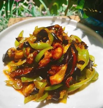 3.再把尖椒放入煸炒之后,将酱汁倒入锅中放入茄子一起翻炒,出锅装盘即可。