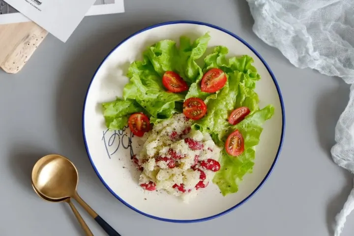 3. 取一个盘子,将拌好的菜花米放在一旁,放生菜;