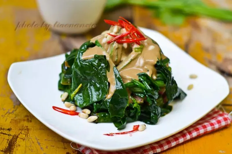 菠菜,红美人椒,芝麻酱,油辣椒,松子,生抽,盐,调味粉