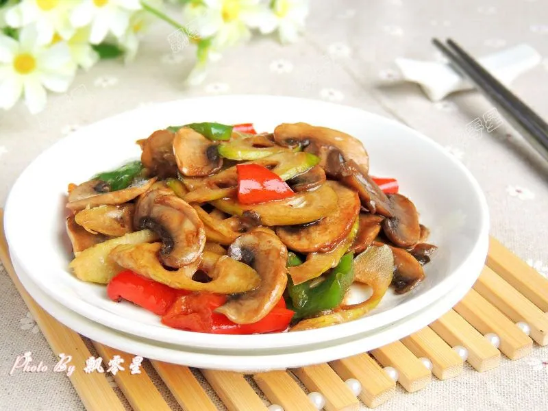 2. 竹笋,口蘑,青红椒分别切片,生姜切片;