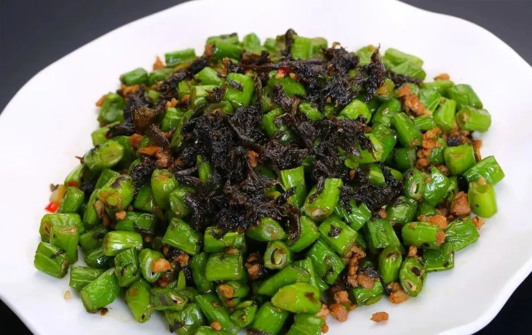 3.下四季豆翻炒均匀,四季豆一定要炒熟,为了熟得快,可以切薄切细一些