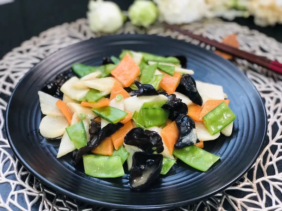 4. 热锅入油,依次加入胡萝卜、山药、黑木耳,最后放入荷兰豆翻炒;
