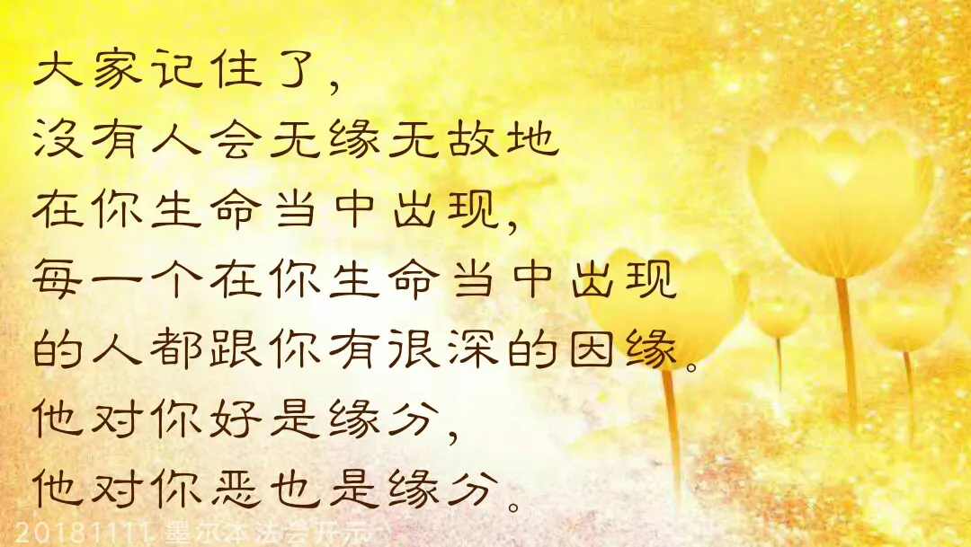 大家记住了,没有人会无缘无故地在你生命当中出现,每一个在你生命当中出现的人都跟你有很深的因缘。他对你好是缘分,他对你恶也是缘分。