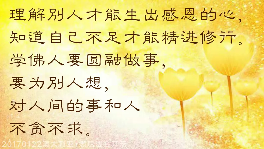 在人生的修行中,让我们接纳一切因缘吧,无论是顺缘还是逆缘,都是我们的功课。希望大家懂得珍惜人生。爸爸妈妈为我们好,爷爷奶奶为我们好,老师、朋友为我们好,这一切都把它当成一种因缘。我们在这些因缘中,要去抓住随缘、惜缘和了缘,好好地锻炼自己的身心,自在而行。
