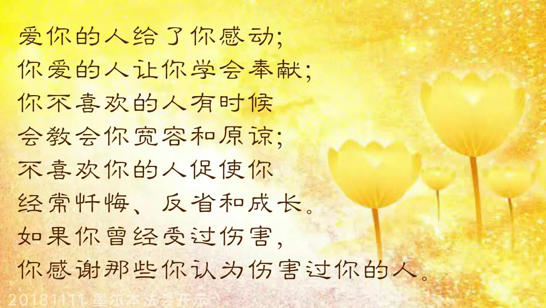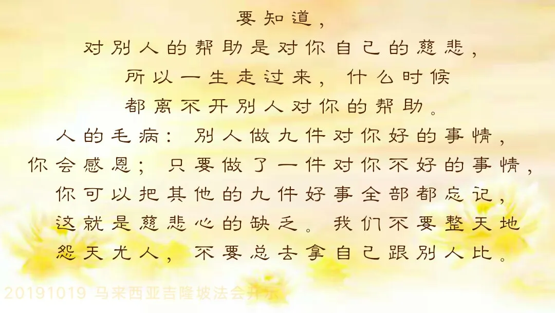 所以学佛人要教育好每个孩子。就算父母有钱,看到父母的白发,也要学会感恩;看到别人的付出,要学会知足。你看我们今天来开法会,有多少义工在付出啊!当我们吃着美味佳肴,坐在这里在好好地听着师父开示的时候,你们要学会感恩,有多少人为你们付出。这就是要学会知足,因为知足的人才能快乐无边。要知道,对别人的帮助是对你自己的慈悲,所以一生走过来,什么时候都离不开别人对你的帮助。人的毛病:别人做九件对你好的事情,你会感恩;只要做了一件对你不好的事情,你可以把其他的九件好事全部都忘记,这就是慈悲心的缺乏。我们不要整天地怨天尤人,不要总去拿自己跟别人比。