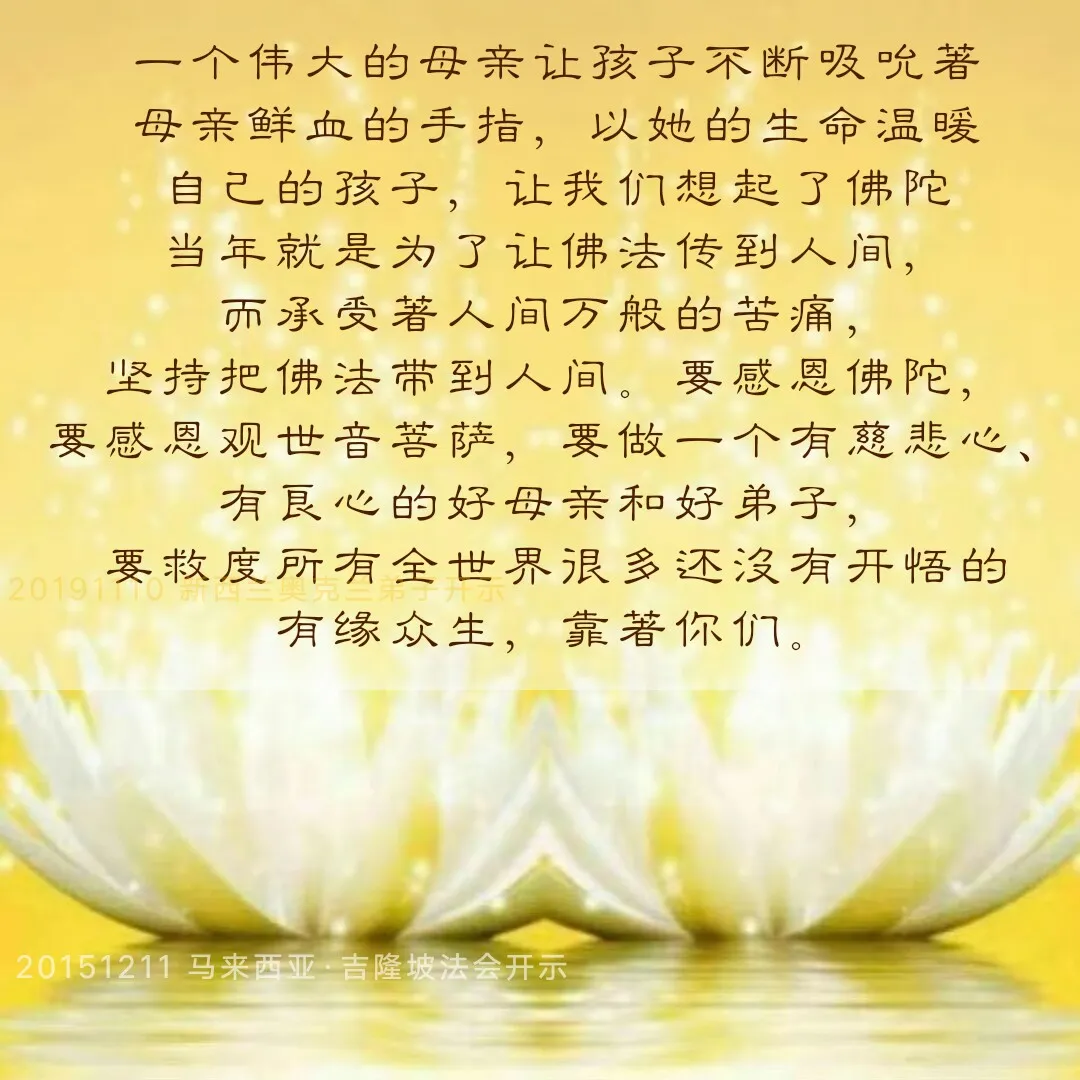 年仅三岁的女儿怎么能熬过无食物又无饮水而且阴湿寒冷的八天?是因为她躲在母亲的怀抱中。母亲割破自己手指,让孩子吸自己的血液,吸取养分,以维持生命。一个伟大的母亲让孩子不断吸吮着母亲鲜血的手指,以她的生命温暖自己的孩子,让我们想起了佛陀当年就是为了让佛法传到人间,而承受着人间万般的苦痛,坚持把佛法带到人间。要感恩佛陀,要感恩观世音菩萨,要做一个有慈悲心、有良心的好母亲和好弟子,要救度所有全世界很多还没有开悟的有缘众生,靠着你们。