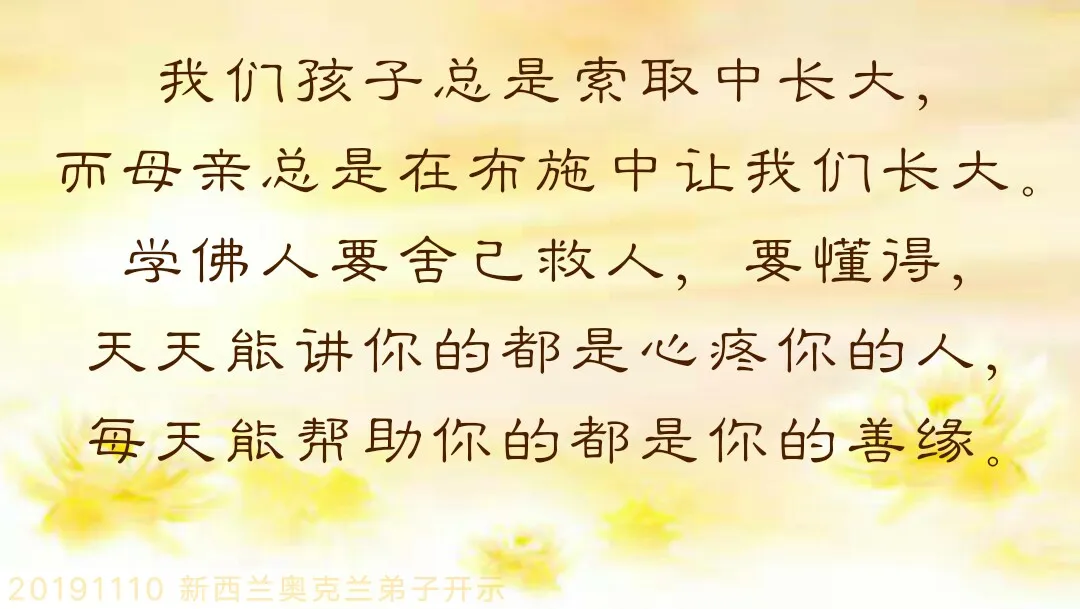 这就是母亲。我们孩子总是索取中长大,而母亲总是在布施中让我们长大。学佛人要舍己救人,要懂得,天天能讲你的都是心疼你的人,每天能帮助你的都是你的善缘。