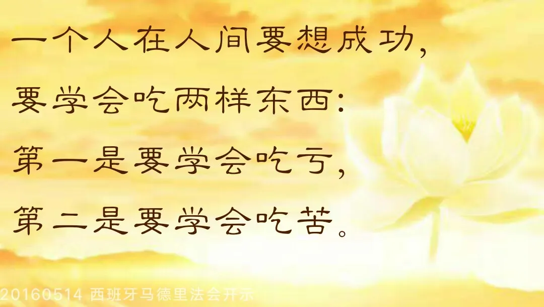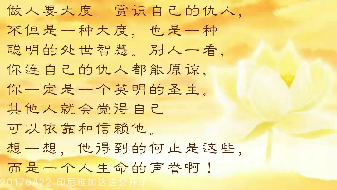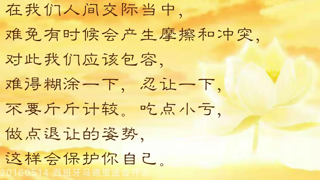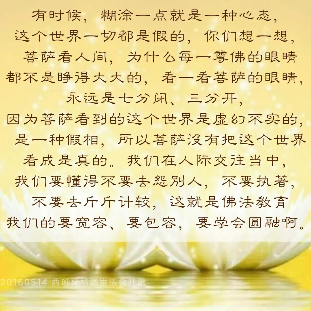 在我们人间交际当中,难免有时候会产生摩擦和冲突,对此我们应该包容,难得糊涂一下,忍让一下,不要斤斤计较。吃点小亏,做点退让的姿势,这样会保护你自己。师父跟你们讲,一个人在人间要想成功,要学会吃两样东西:第一是要学会吃亏,第二是要学会吃苦。有时候,糊涂一点就是一种心态,这个世界一切都是假的,你们想一想,菩萨看人间,为什么每一尊佛的眼睛都不是睁得大大的,看一看菩萨的眼睛,永远是七分闭、三分开,因为菩萨看到的这个世界是虚幻不实的,是一种假相,所以菩萨没有把这个世界看成是真的。我们在人际交往当中,我们要懂得不要去怨别人,不要执着,不要去斤斤计较,这就是佛法教育我们的要宽容、要包容,要学会圆融啊。