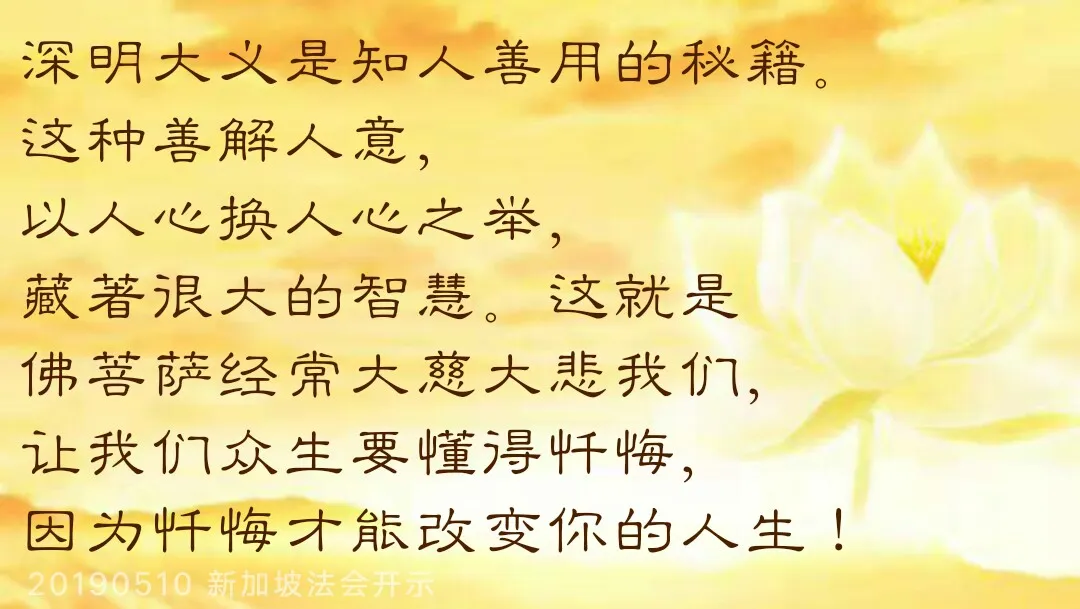 所以,深明大义是知人善用的秘籍。这种善解人意,以人心换人心之举,藏着很大的智慧。这就是佛菩萨经常大慈大悲我们,让我们众生要懂得忏悔,因为忏悔才能改变你的人生!