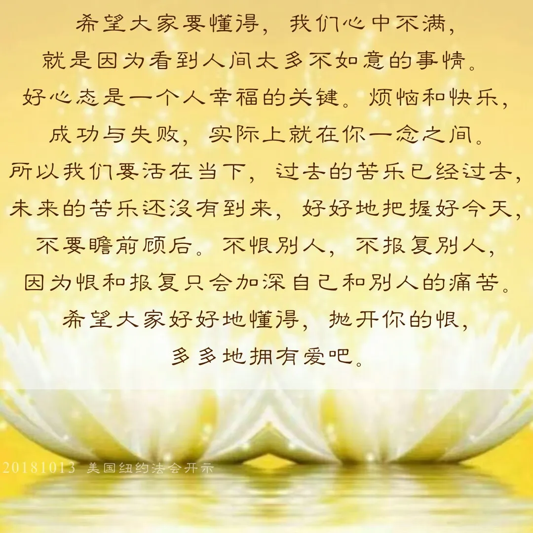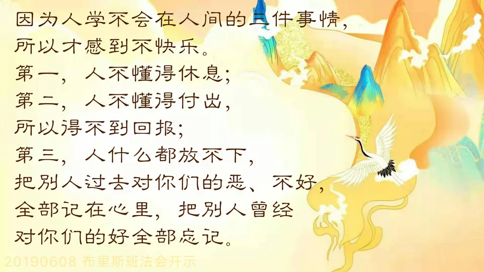 原来因为人学不会在人间的三件事情,所以才感到不快乐。第一,人不懂得休息;第二,人不懂得付出,所以得不到回报;第三,人什么都放不下,把别人过去对你们的恶、不好,全部记在心里,把别人曾经对你们的好全部忘记。