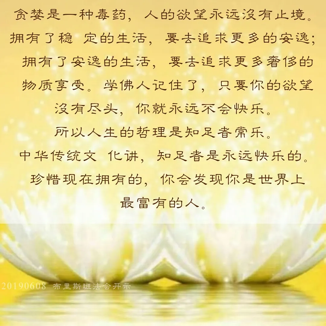 贪婪是一种毒药,人的欲望永远没有止境。拥有了稳定的生活,要去追求更多的安逸;拥有了安逸的生活,要去追求更多奢侈的物质享受。学佛人记住了,只要你的欲望没有尽头,你就永远不会快乐。所以人生的哲理是知足者常乐。中华传统文 化讲,知足者是永远快乐的。珍惜现在拥有的,你会发现你是世界上最富有的人。
