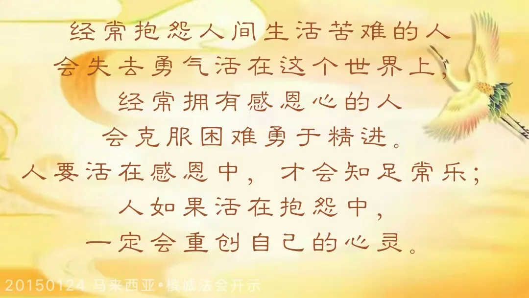 有两个人在沙漠中行走,所带的水已经用完,口渴难耐之时遇到一个赶骆驼的老人家,老人颤巍巍地给了两人各半碗水。一个人心态不好,抱怨水太少,还不当心洒泼了很多水;另一个人想,水不能解我饥渴,但是感恩菩萨送来圣水,他喝下水,终于成功地走出沙漠,而另外一位因为挑剔抱怨而死于沙漠。经常抱怨人间生活苦难的人会失去勇气活在这个世界上,经常拥有感恩心的人会克服困难勇于精进。人要活在感恩中,才会知足常乐;人如果活在抱怨中,一定会重创自己的心灵。