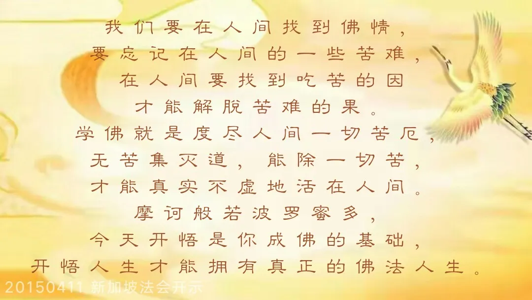 我们要在人间找到佛情,要忘记在人间的一些苦难,在人间要找到吃苦的因才能解脱苦难的果。学佛就是度尽人间一切苦厄,无苦集灭道,能除一切苦,才能真实不虚地活在人间。摩诃般若波罗蜜多,今天开悟是你成佛的基础,开悟人生才能拥有真正的佛法人生。