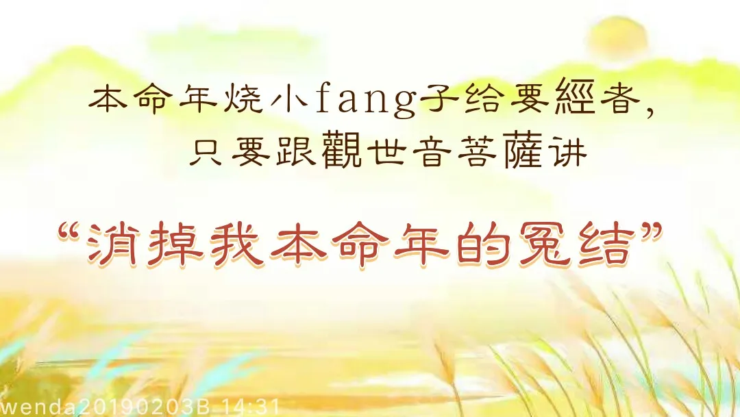 女听众:師父曾经开示过,本命年烧小fang子给要jing者,只要跟觀世音菩薩讲“消掉我本命年的冤结”。请问师父,其他犯太岁的属相的师兄是否也应该跟观世音菩萨祈求来化解冤结?